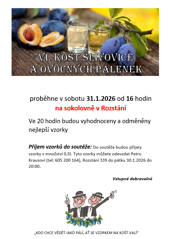 Zveme všechny příznivce domácí slivovice a ovocných pálenek na šestý ročník koštu slivovic, ovocných pálenek a domácích likérů v Rozstání, který se uskuteční na sokolovně v sobotu 31. ledna 2026 od 16 hodin. Vzorky svých pálenek o obsahu 0,5 litru můžete odevzdat Petru Krausovi na adrese Rozstání 33
